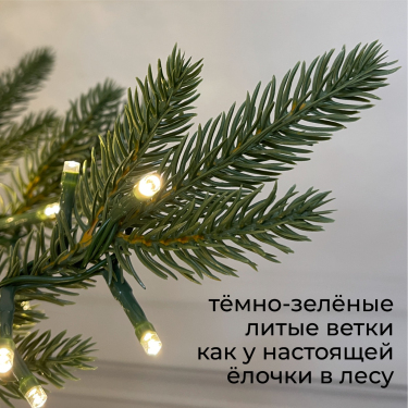 Ветви украшены встроенной LED-подсветкой тёплого оттенка. Лампочки равномерно распределены по всему дереву, создавая эффект мягкого, живого сияния - словно солнечные лучи играют на снегу. Свет приглушённый, уютный и не раздражает глаза, наполняя дом атмосферой уюта и праздника.