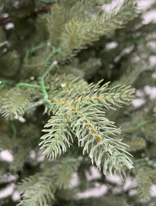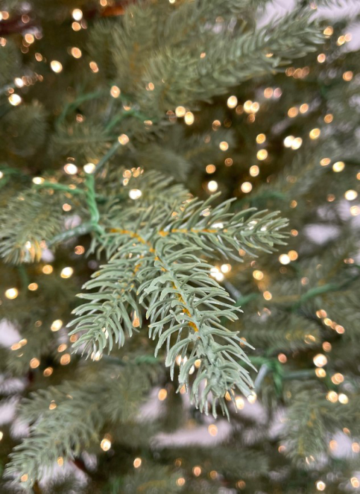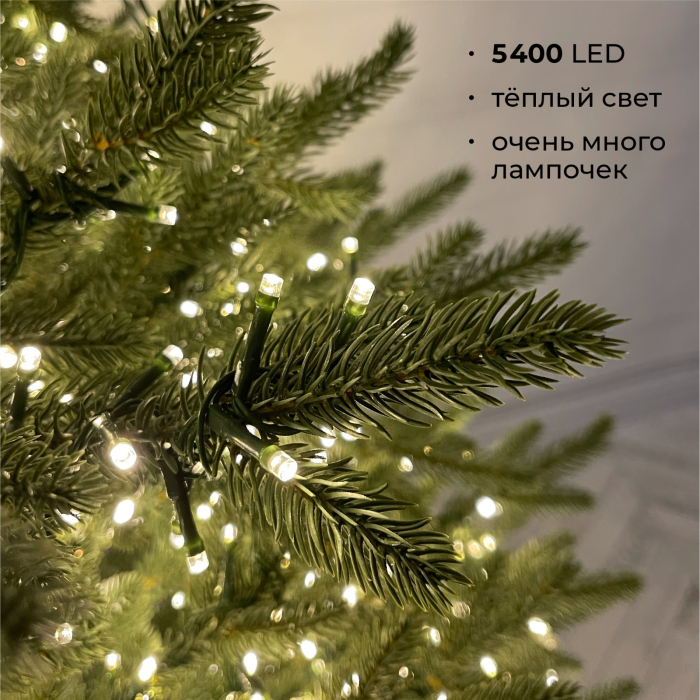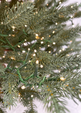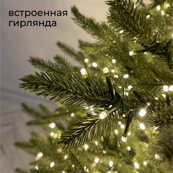 Ветви украшены встроенной LED-подсветкой тёплого оттенка. Лампочки равномерно распределены по всему дереву, создавая эффект мягкого, живого сияния - словно солнечные лучи играют на снегу. Свет приглушённый, уютный и не раздражает глаза, наполняя дом атмосферой уюта и праздника.