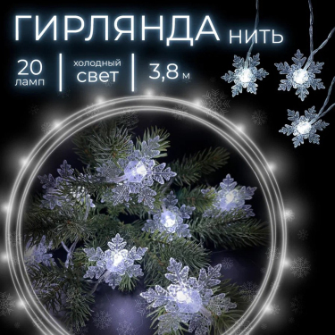 Гирлянда LED Снежинки на батарейках, холодный свет, 20 ламп, 8 функций