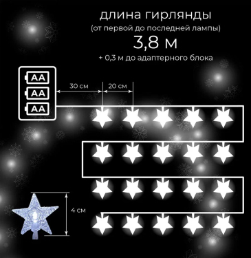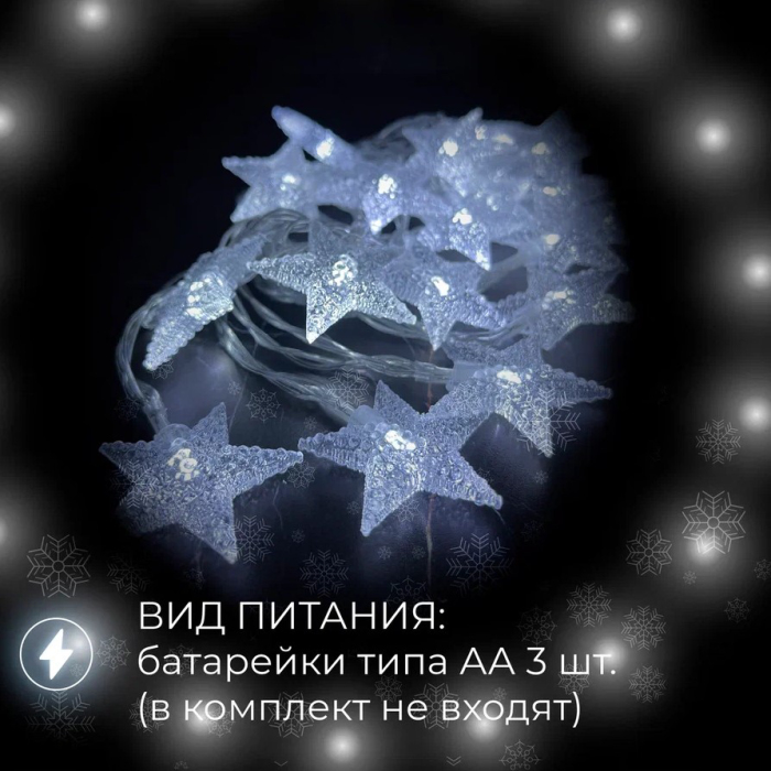 Гирлянда LED Звезды на батарейках, холодный свет, 20 ламп, 8 функций