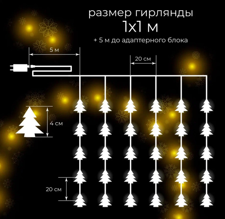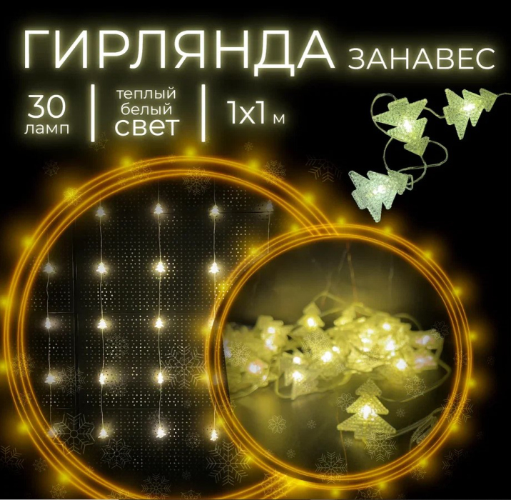 Гирлянда-занавес LED Елочка, теплый белый свет, 30 ламп, 8 функций, 100х100 см